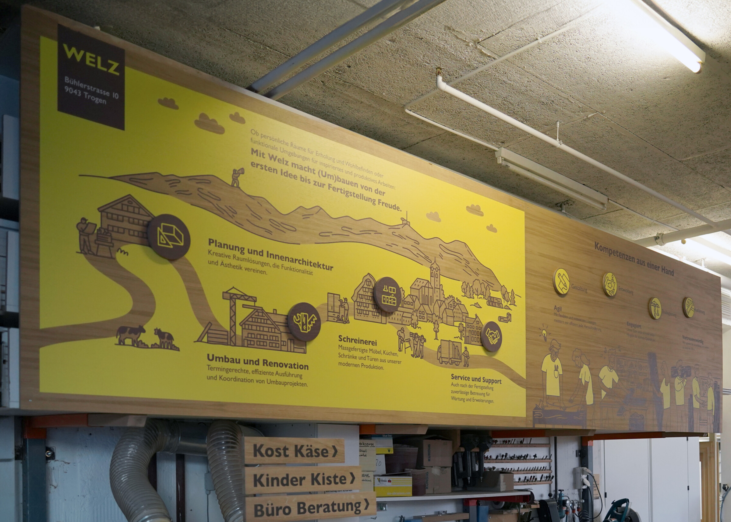 Um die handwerkliche Tradition und Materialverbundenheit zu unterstreichen, liess Welz das Zielbild direkt auf eine Holzplatte übertragen. Es vereint Strategie und handwerklichen Anspruch. Prominent in der Werkstatt montiert, dient das Bild als Orientierung und Inspiration im Unternehmensalltag.