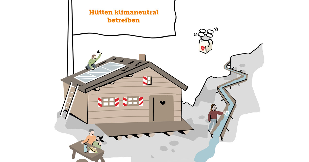 Das interaktive Wimmelbild veranschaulicht die Klimastrategie des SAC und zeigt, wie die Hütten und die Bergsport-Community gemeinsam bis 2040 klimaneutral werden.