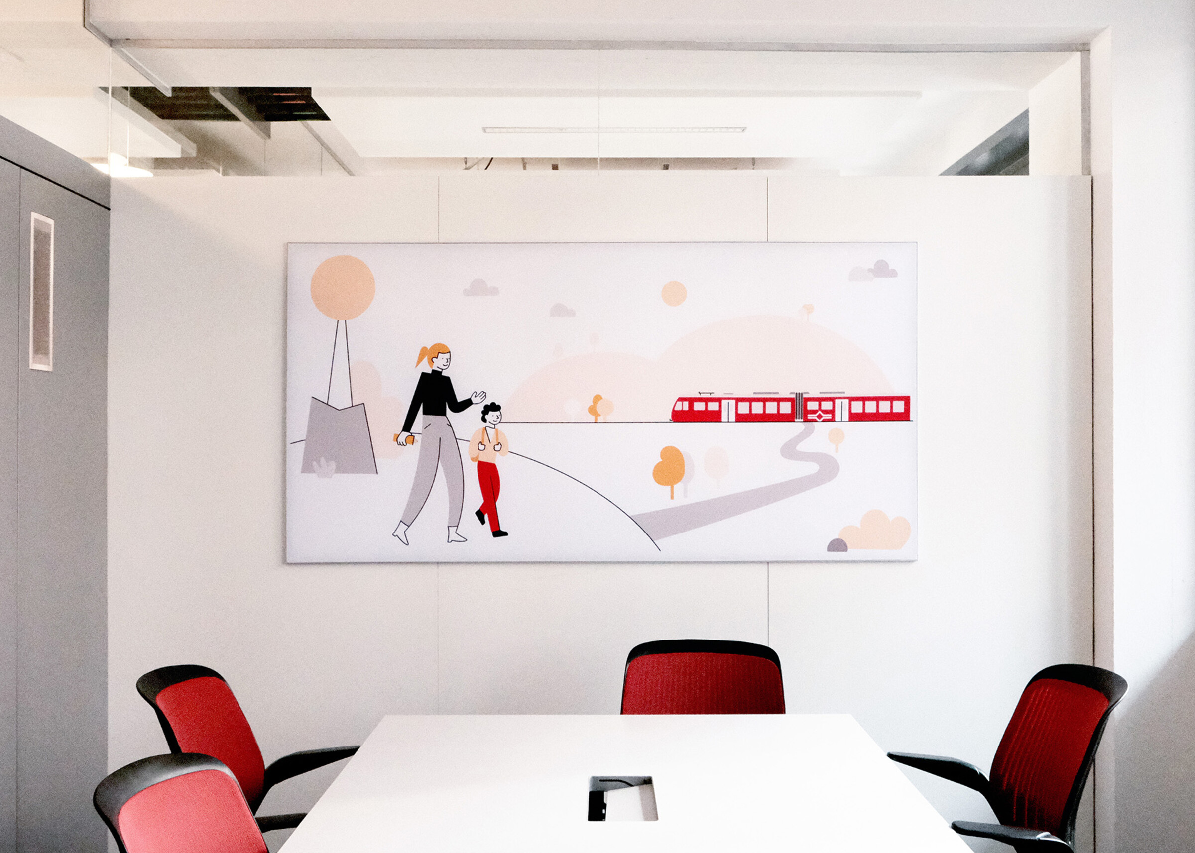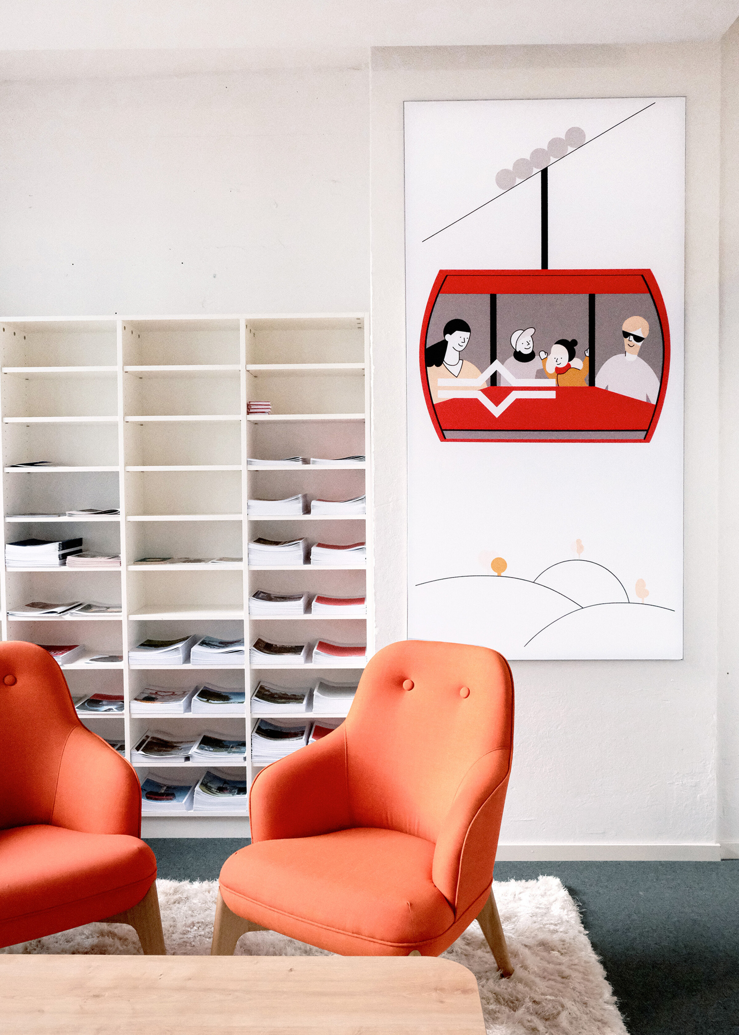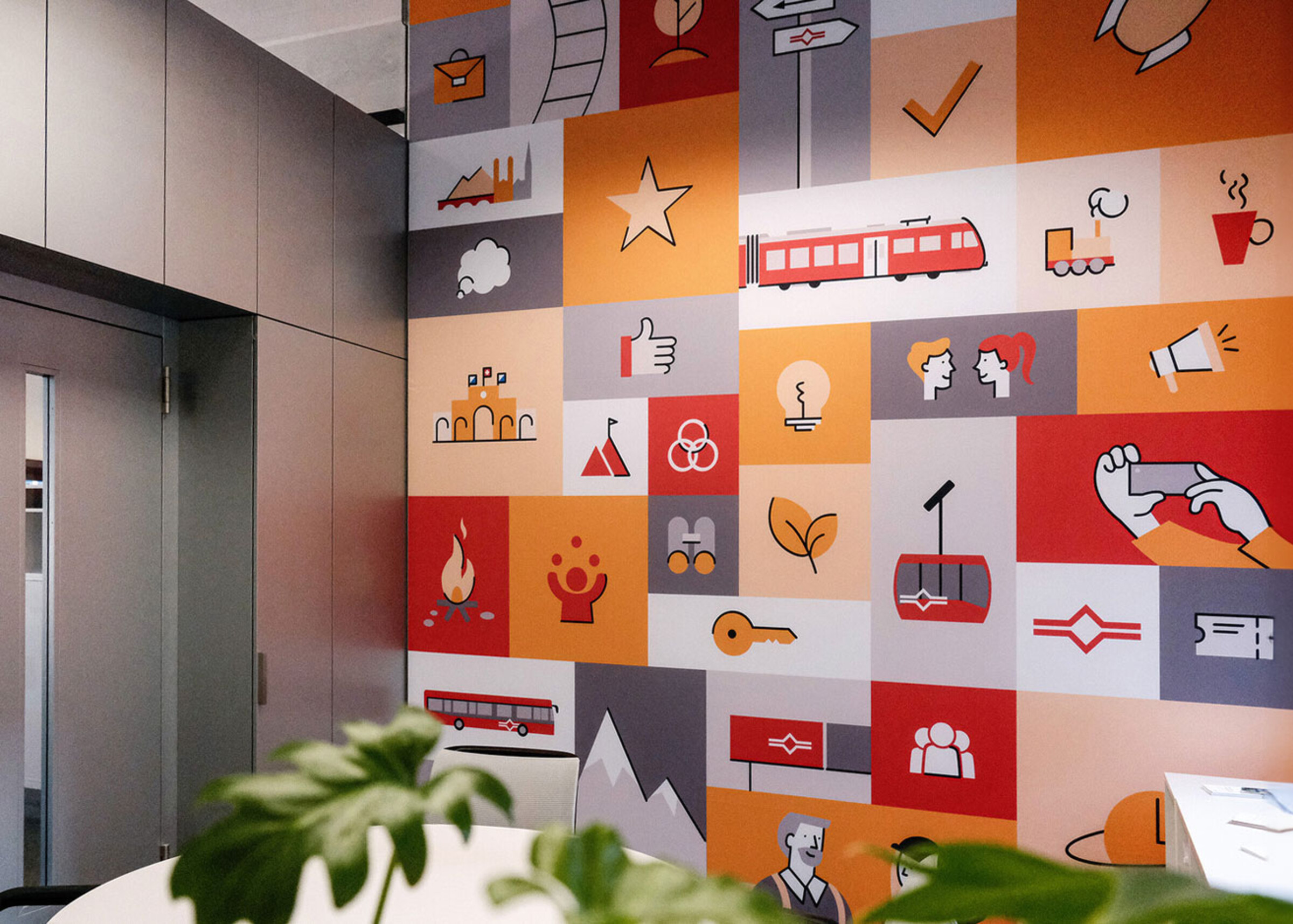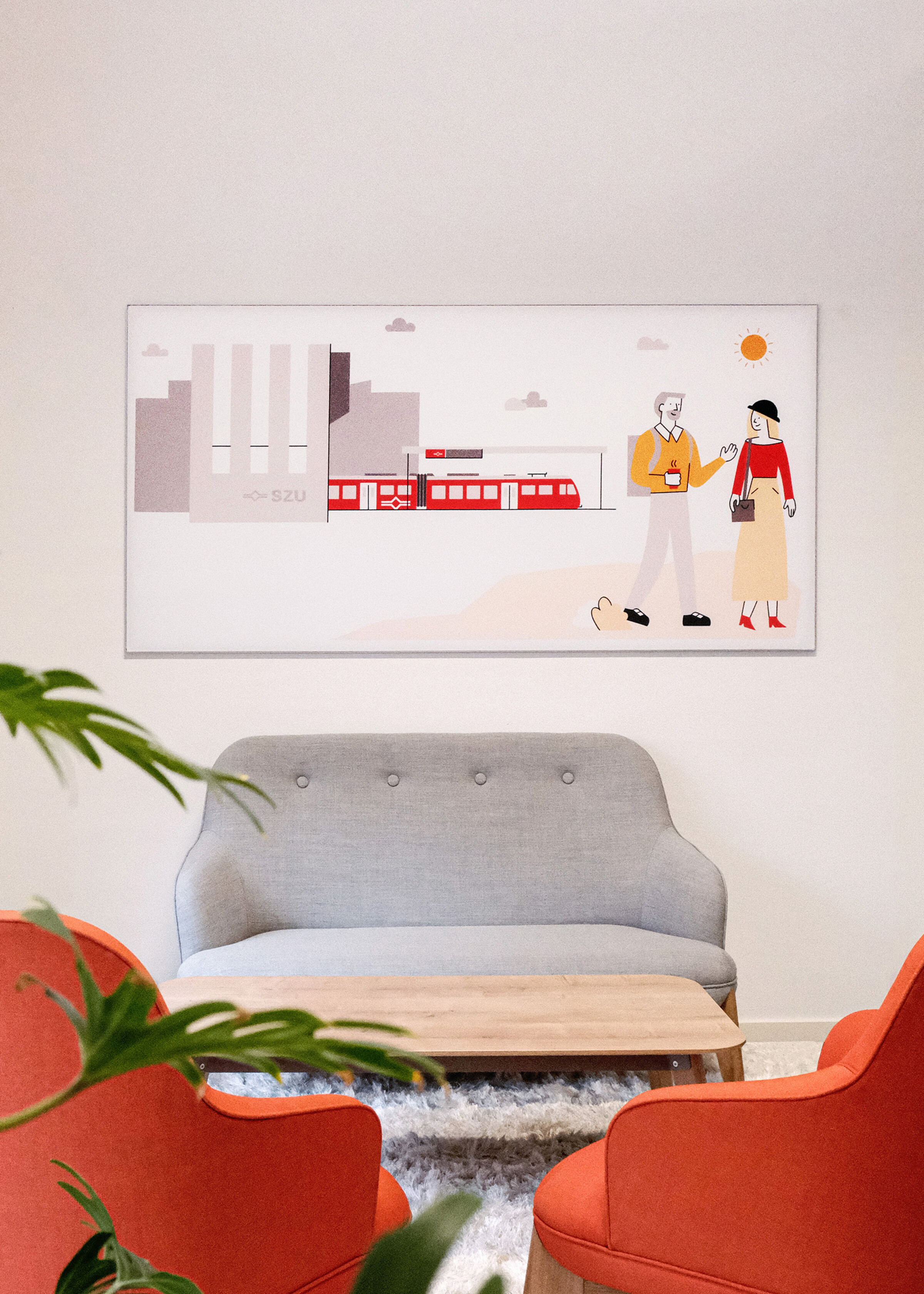 Um die Geschäftsräume der SZU persönlicher zu gestalten, entwickelten wir Wandbilder in der Illustrationssprache des Corporate Designs. Die grossflächigen Visuals füllen die Räume mit warmen Farben und schaffen eine frische Arbeitsatmosphäre für die Mitarbeitenden.