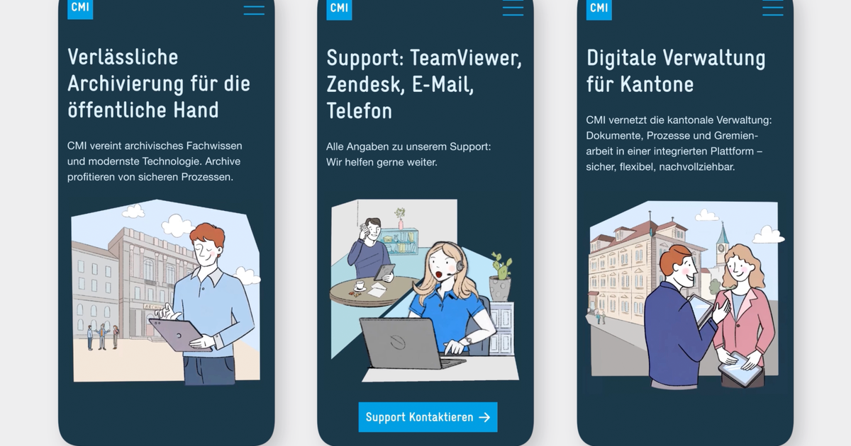 Die CMI Informatik entwickelt massgeschneiderte Softwarelösungen für die öffentliche Hand. Mit dem Redesign der Website werden die Angebote des IT-Unternehmens nutzerfreundlich strukturiert, und das Screendesign erhält einen zeitgemässen Refresh.