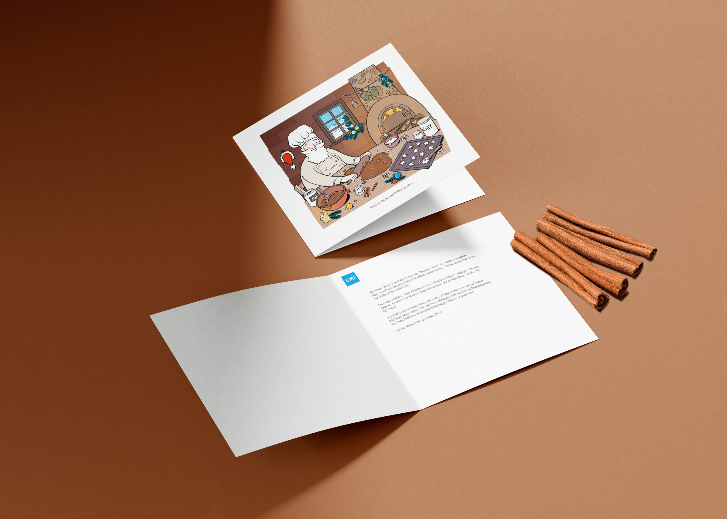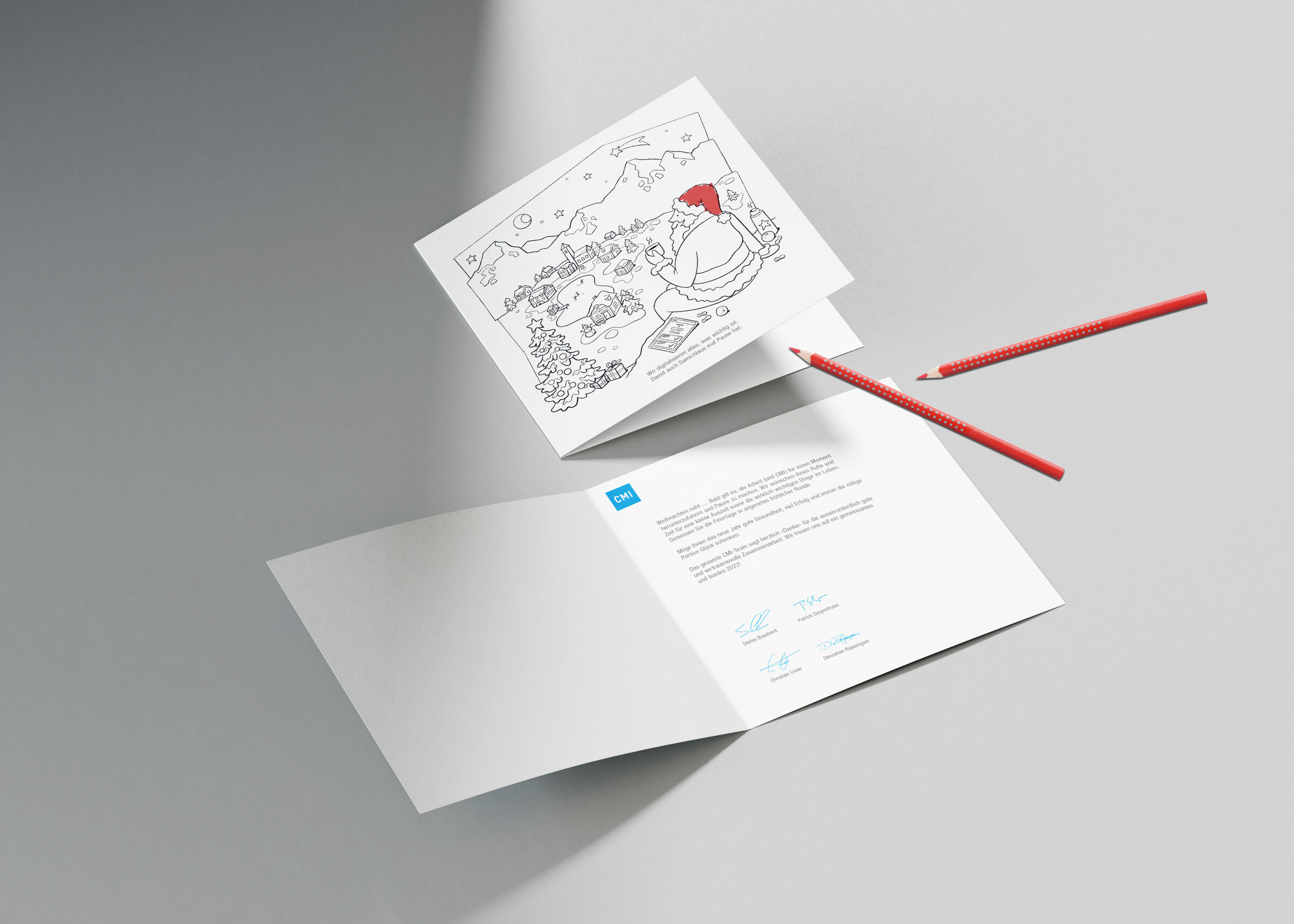 Seit mehreren Jahren überrascht unser Kunde CMI mit ganz besonderen Weihnachtskarten: mal als Ausmalkarte, mal mit QR-Code zu einem festlichen Lied, mal sogar mit einem Hauch von Zimt.