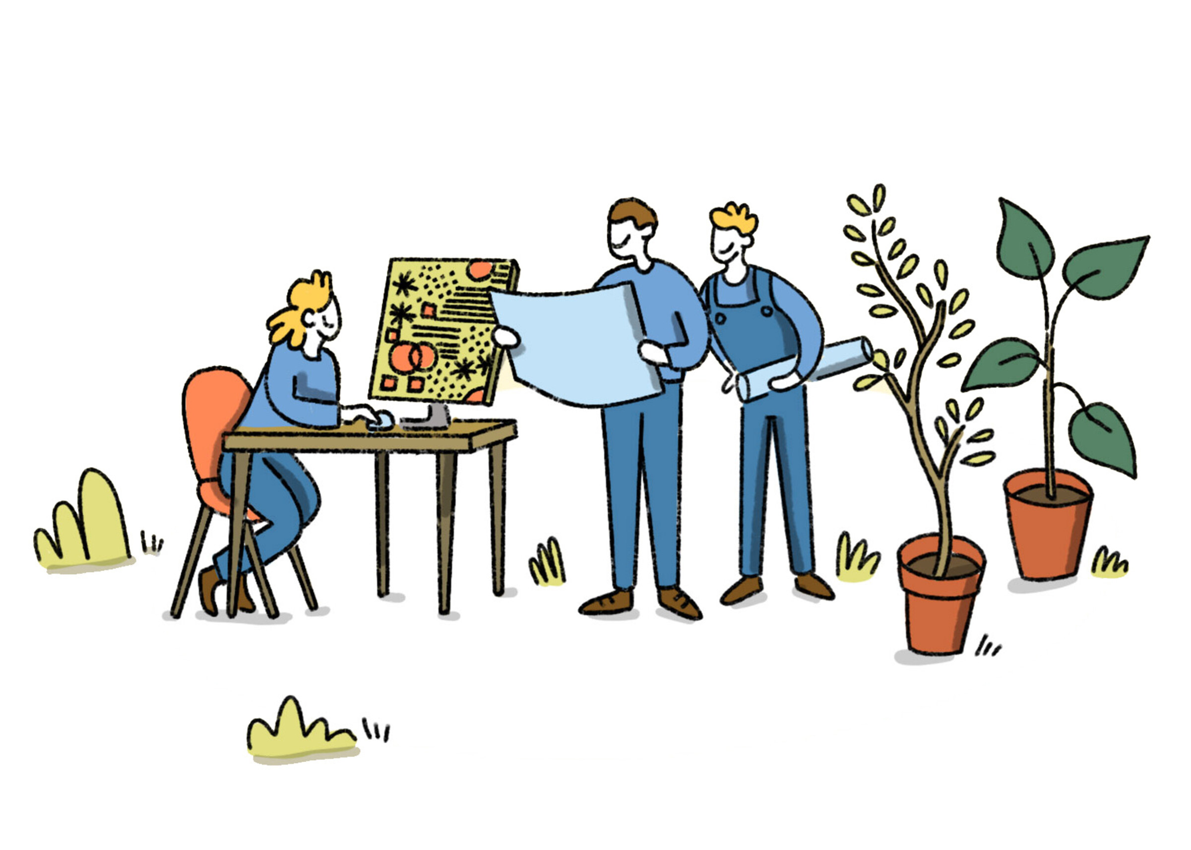 Um den Bildungsweg im Garten- und Landschaftsbau sowie im Bereich Produktion darzustellen, gestalteten wir zwei detaillierte Wimmelbilder. Die verschiedenen Kompetenzen lassen sich über einen Verbindungsweg entdecken.