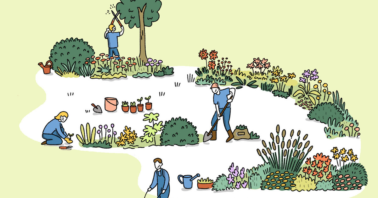 Die verschiedenen Ausbildungsbereiche lassen sich in den Wimmelbildern entlang eines Weges entdecken, der durch den Garten führt und die Vielfalt des Berufs auf spielerische Weise sichtbar macht.