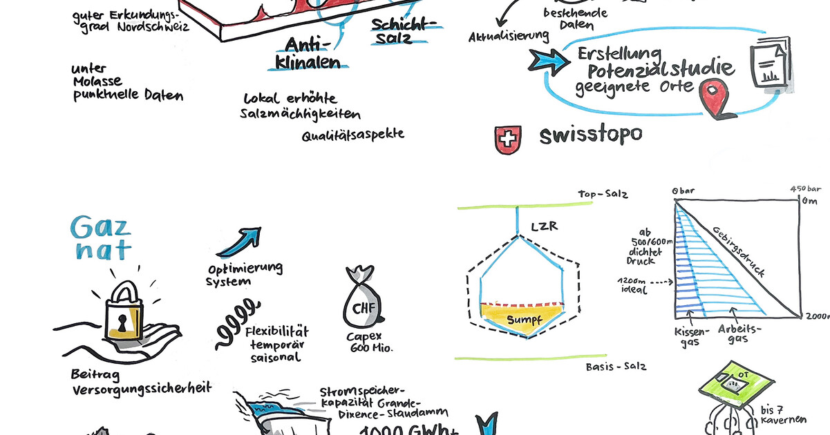Mit Unterstützung des Bundesamts für Energie, der swisstopo und der AXPO organisierten die Schweizer Salinen ein Symposium, das Expertinnen und Experten sowie Interessierte aus Industrie, Verwaltung und Wissenschaft zusammenbrachte. Ziel war es, das Potential von Speicherkavernen als Energiespeicher aus unterschiedlichen Perspektiven zu beleuchten und eine erste breit angelegte Diskussion in der Schweiz anzustossen.